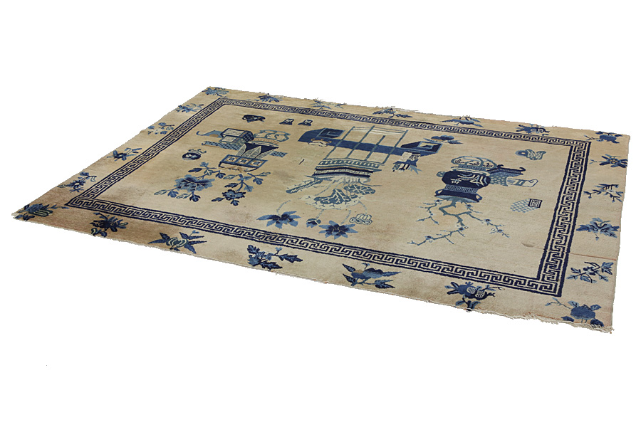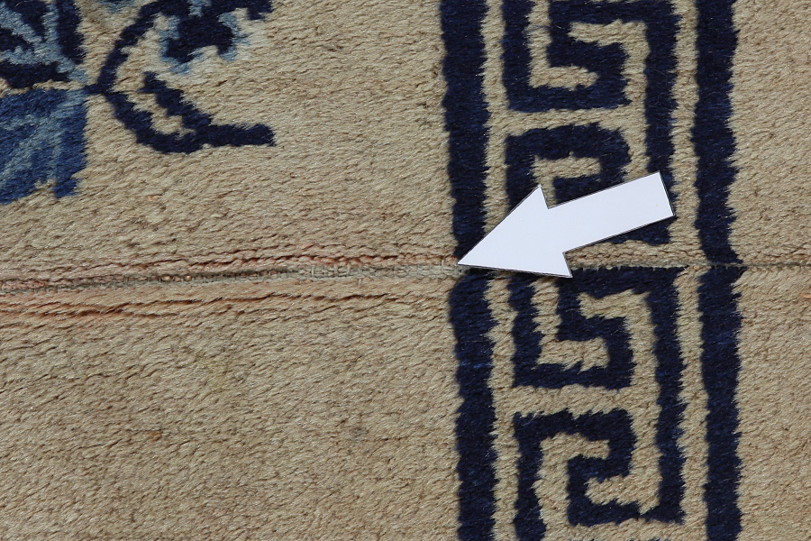 Khotan Carpets : Handwoven in or about the ancient city of Khotan (Hotan) in the southern Uygur Autonomous Region of Xinjiang (Chinese Turkistan). They combine Chinese details with Central Asian design schemes and Western vivid coloring, except where recent fugitive dyes have reduced their effect to washed-out pastels. Khotan carpets with woolen pile have cotton warp and mixed-color wool or cotton weft and are usually made with the asymmetrical knot. Field colors may be blue, yellow, or white, aswell as the usual red.