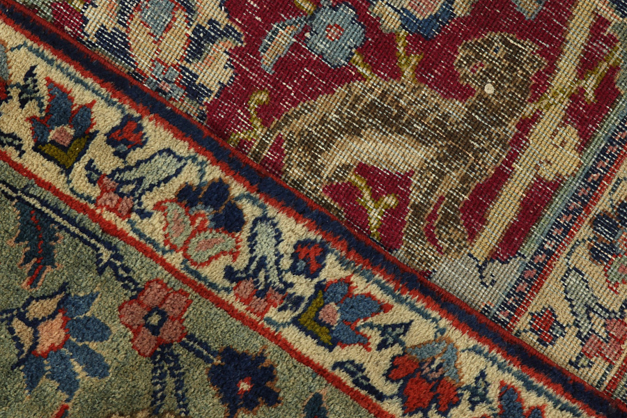 Abrash: Due to the different amount of grease in the wool and the added salt during the process of dyeing, the wool has got a varying colour absorbance. This is not very visible before weaving. During the weaving though, lines of the same colour are formed in the carpet. This is called Abrash (which in Farsi means little cloud) and it shows that the wool was not manufactured using chemical means and marks the naturalness and authenticity of the carpets. Examples