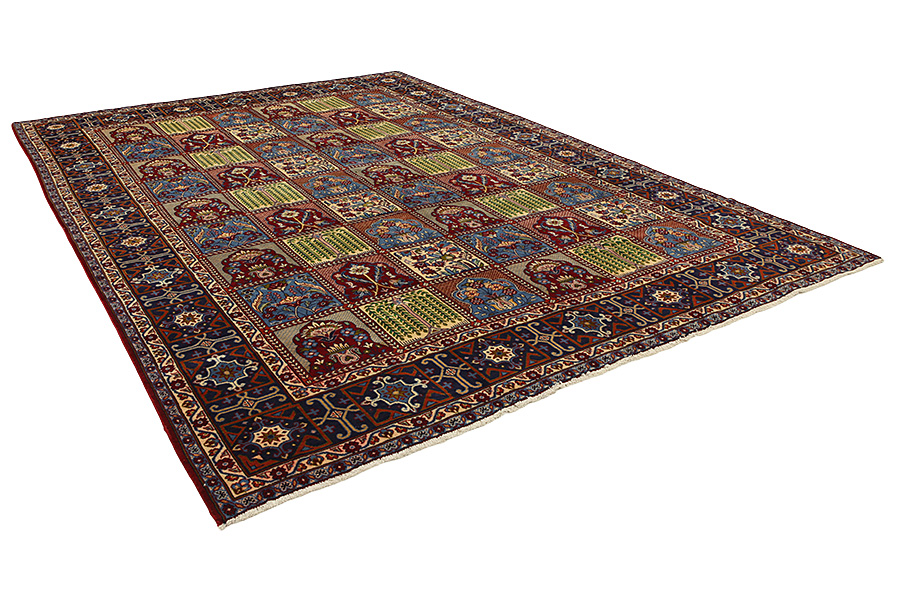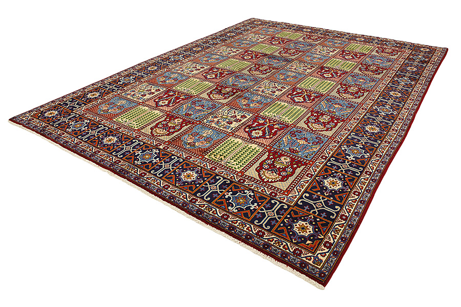 Bakhtiari Carpets : In the mountains Zagros, west of the city of Isfahan, around the town of Shahr-e-Kurd, live the nomads Bakhtiar. Their carpets are known for the design with various repeating squares in which flowers and animals are depicted. For this reason the design is called "garden"(Khesti). Their carpets are very durable with a dense weave and very good quality Persian wool coming from sheep grazing at a high altitude. The best Bakhtiar rugs and carpets with highest knot density are often called Bibibaff. Also in many designs we see influences from Isfahan carpets. (Boldaji - Feridan - Saman).