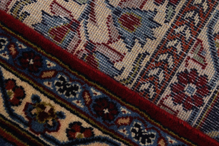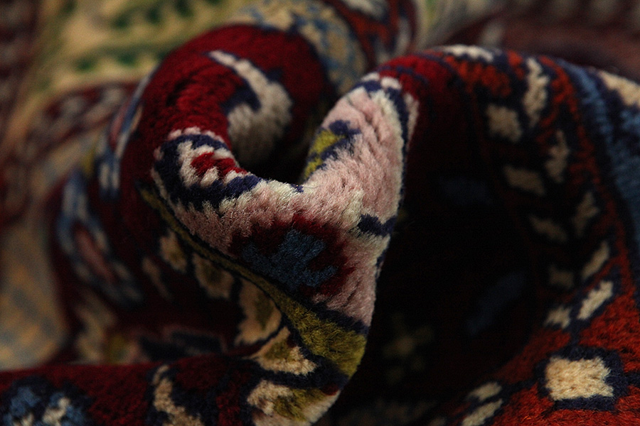 Abrash: Due to the different amount of grease in the wool and the added salt during the process of dyeing, the wool has got a varying colour absorbance. This is not very visible before weaving. During the weaving though, lines of the same colour are formed in the carpet. This is called Abrash (which in Farsi means little cloud) and it shows that the wool was not manufactured using chemical means and marks the naturalness and authenticity of the carpets. Examples