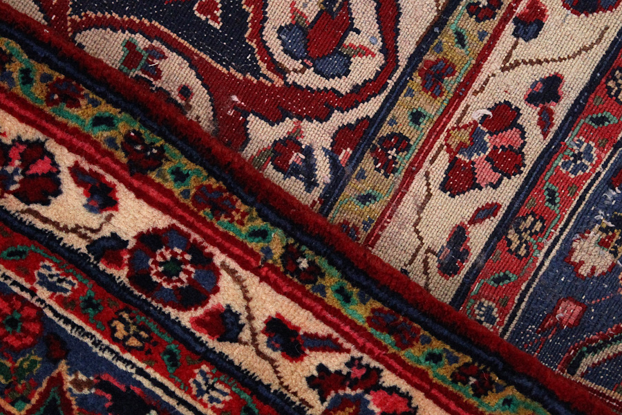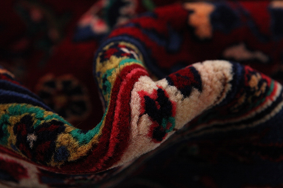 Abrash: Due to the different amount of grease in the wool and the added salt during the process of dyeing, the wool has got a varying colour absorbance. This is not very visible before weaving. During the weaving though, lines of the same colour are formed in the carpet. This is called Abrash (which in Farsi means little cloud) and it shows that the wool was not manufactured using chemical means and marks the naturalness and authenticity of the carpets. Examples