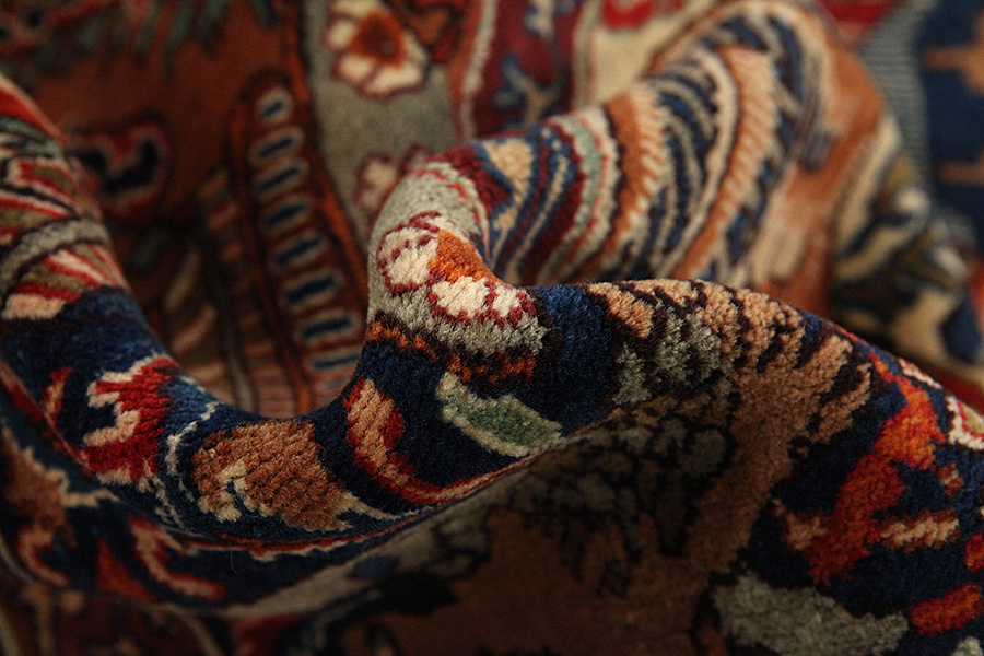 Abrash: Due to the different amount of grease in the wool and the added salt during the process of dyeing, the wool has got a varying colour absorbance. This is not very visible before weaving. During the weaving though, lines of the same colour are formed in the carpet. This is called Abrash (which in Farsi means little cloud) and it shows that the wool was not manufactured using chemical means and marks the naturalness and authenticity of the carpets. Examples