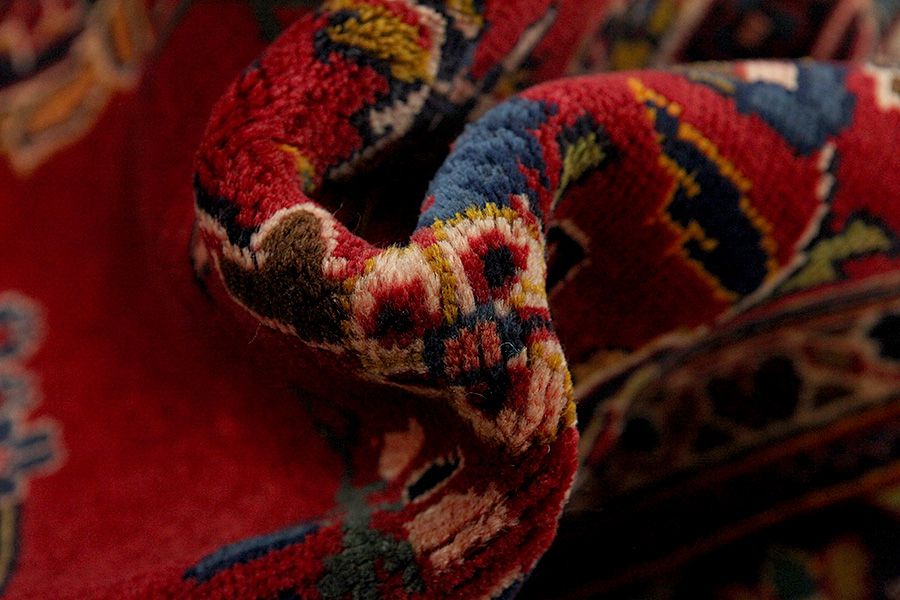 Abrash: Due to the different amount of grease in the wool and the added salt during the process of dyeing, the wool has got a varying colour absorbance. This is not very visible before weaving. During the weaving though, lines of the same colour are formed in the carpet. This is called Abrash (which in Farsi means little cloud) and it shows that the wool was not manufactured using chemical means and marks the naturalness and authenticity of the carpets. Examples