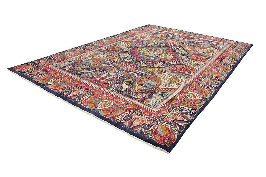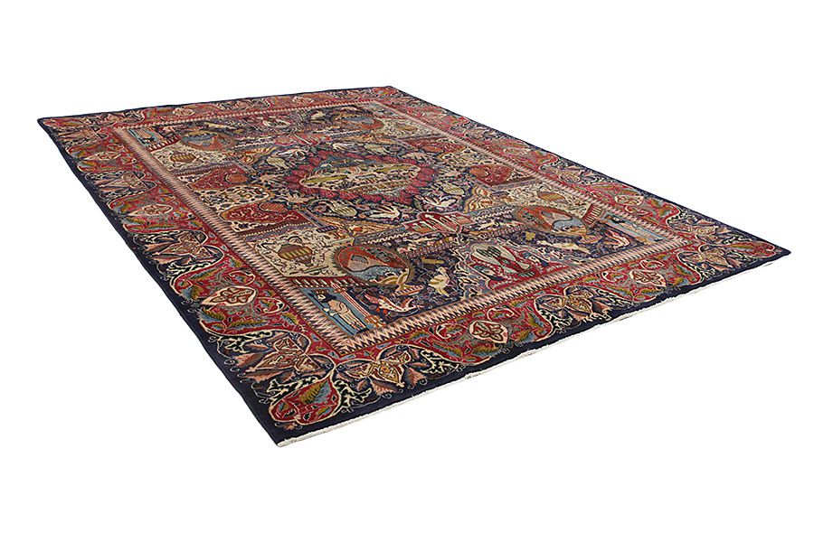 Kashmar Carpets : The city of Kashmar is located in the Khorasan province southwest of the city Mashad in Eastern Iran. It has a very rich history and its old name is Torshiz. Exquisite high quality carpets have been woven for centuries there. The carpets are woven thick, with fine soft wool in beautiful blue colors in contrast with cream and ivory beige. In newer carpets they use soft green, red and brown. Characteristic of Kashmar carpets are the large sizes and the unique designs that look like paintings with trees, flowers and domes of mosques. Also depicted are representations that recount historical events, major incidents from Persian history or a historically known person or the story of a revered Persian king. In Kashmar they weave elegant masterpieces of color harmony, complexity of designs in detail, to show the Persian love of beauty and art. Kashmar rugs and carpets are durable and grow more beautiful with time.