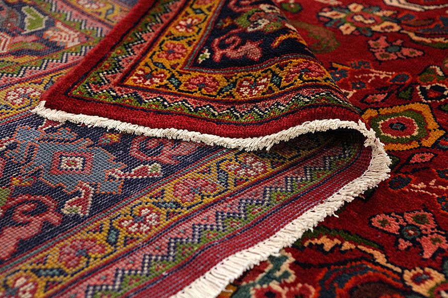 Abrash: Due to the different amount of grease in the wool and the added salt during the process of dyeing, the wool has got a varying colour absorbance. This is not very visible before weaving. During the weaving though, lines of the same colour are formed in the carpet. This is called Abrash (which in Farsi means little cloud) and it shows that the wool was not manufactured using chemical means and marks the naturalness and authenticity of the carpets. Examples