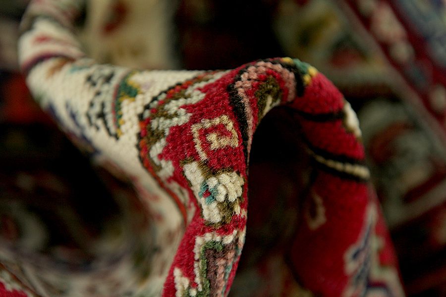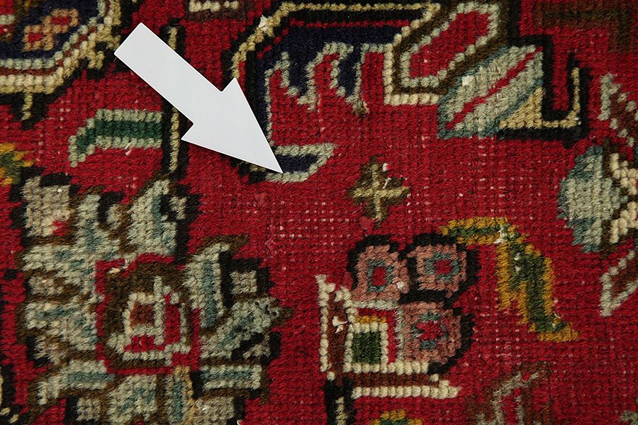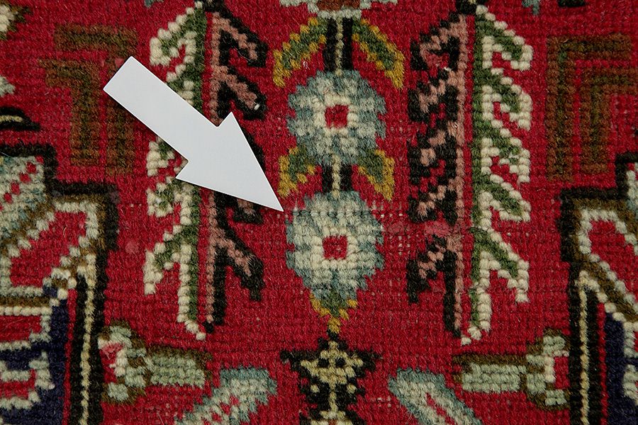 Abrash: Due to the different amount of grease in the wool and the added salt during the process of dyeing, the wool has got a varying colour absorbance. This is not very visible before weaving. During the weaving though, lines of the same colour are formed in the carpet. This is called Abrash (which in Farsi means little cloud) and it shows that the wool was not manufactured using chemical means and marks the naturalness and authenticity of the carpets. Examples