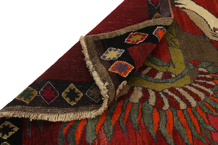Qashqai Carpets : Qashqai carpets are woven by nomads who live in the mountainous areas of Southwest Persia, the provinces of Fars, Khuzestan, south of Isfahan and around the city Shiraz. Their carpets have a high knot density and a wide variety of designs, usually in deep red and blue colors. They weave carpets, Kilims and decorative textiles (ribbons, bags, etc.), which depict scenes from their lives with various representation of humans, animals, birds, trees and flowers. They also depict historical monuments, mostly from Persepolis.