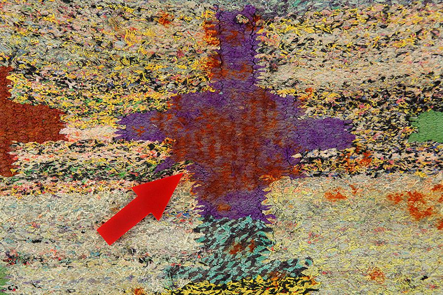 Abrash: Due to the different amount of grease in the wool and the added salt during the process of dyeing, the wool has got a varying colour absorbance. This is not very visible before weaving. During the weaving though, lines of the same colour are formed in the carpet. This is called Abrash (which in Farsi means little cloud) and it shows that the wool was not manufactured using chemical means and marks the naturalness and authenticity of the carpets. Examples