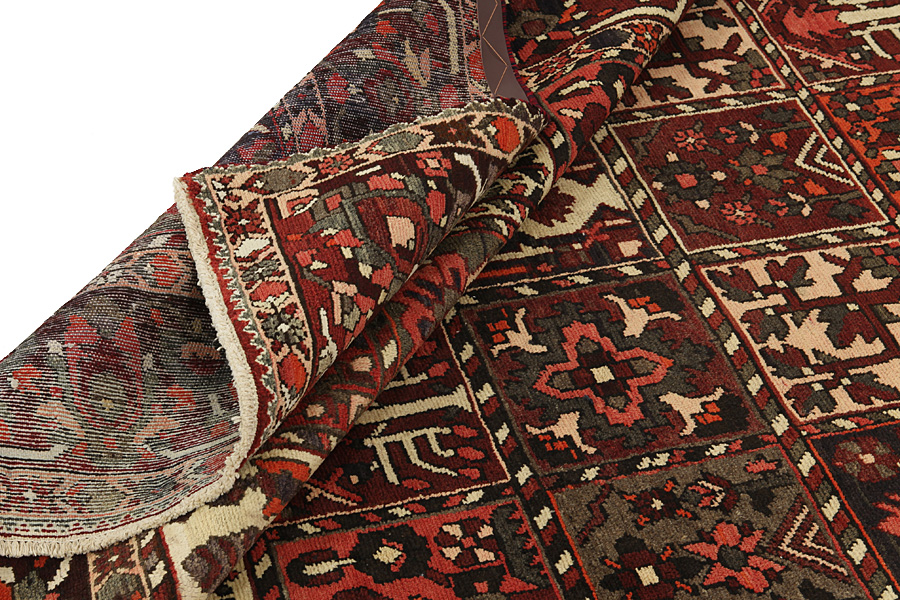 Bakhtiari Carpets : In the mountains Zagros, west of the city of Isfahan, around the town of Shahr-e-Kurd, live the nomads Bakhtiar. Their carpets are known for the design with various repeating squares in which flowers and animals are depicted. For this reason the design is called "garden"(Khesti). Their carpets are very durable with a dense weave and very good quality Persian wool coming from sheep grazing at a high altitude. The best Bakhtiar rugs and carpets with highest knot density are often called Bibibaff. Also in many designs we see influences from Isfahan carpets. (Boldaji - Feridan - Saman).