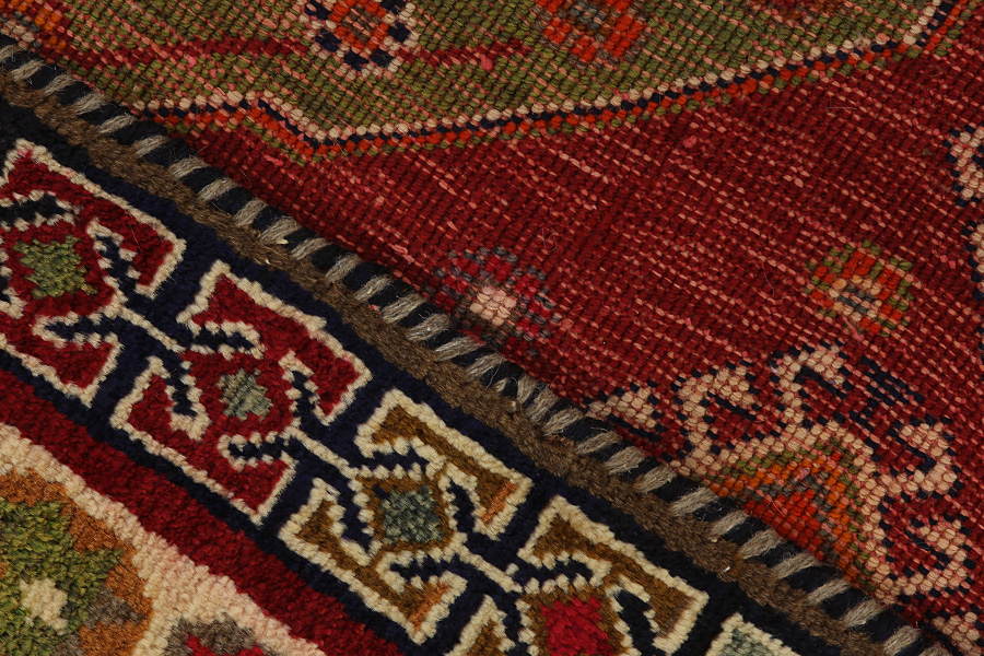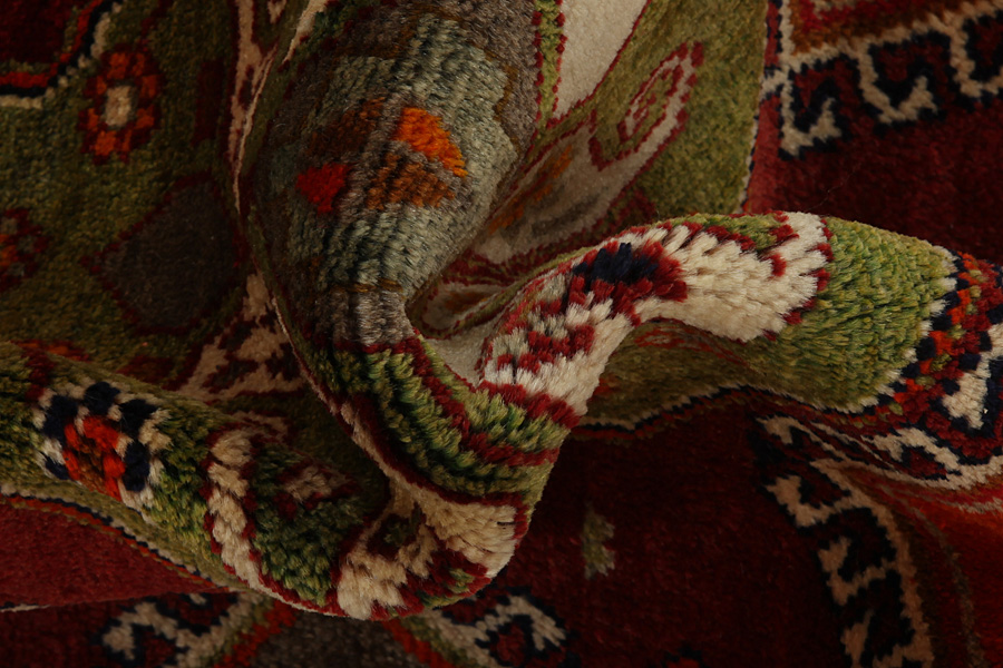 Abrash: Due to the different amount of grease in the wool and the added salt during the process of dyeing, the wool has got a varying colour absorbance. This is not very visible before weaving. During the weaving though, lines of the same colour are formed in the carpet. This is called Abrash (which in Farsi means little cloud) and it shows that the wool was not manufactured using chemical means and marks the naturalness and authenticity of the carpets. Examples