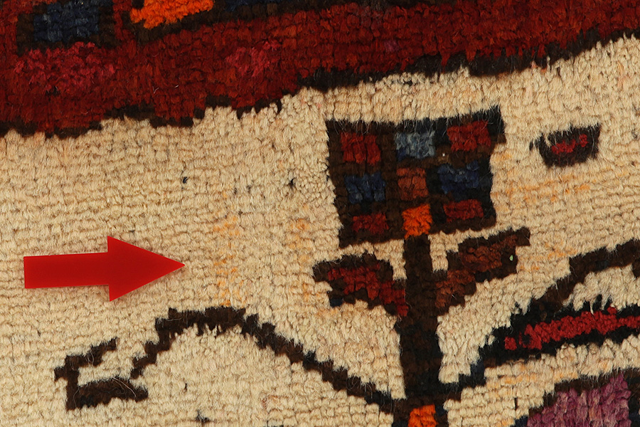 Abrash: Due to the different amount of grease in the wool and the added salt during the process of dyeing, the wool has got a varying colour absorbance. This is not very visible before weaving. During the weaving though, lines of the same colour are formed in the carpet. This is called Abrash (which in Farsi means little cloud) and it shows that the wool was not manufactured using chemical means and marks the naturalness and authenticity of the carpets. Examples