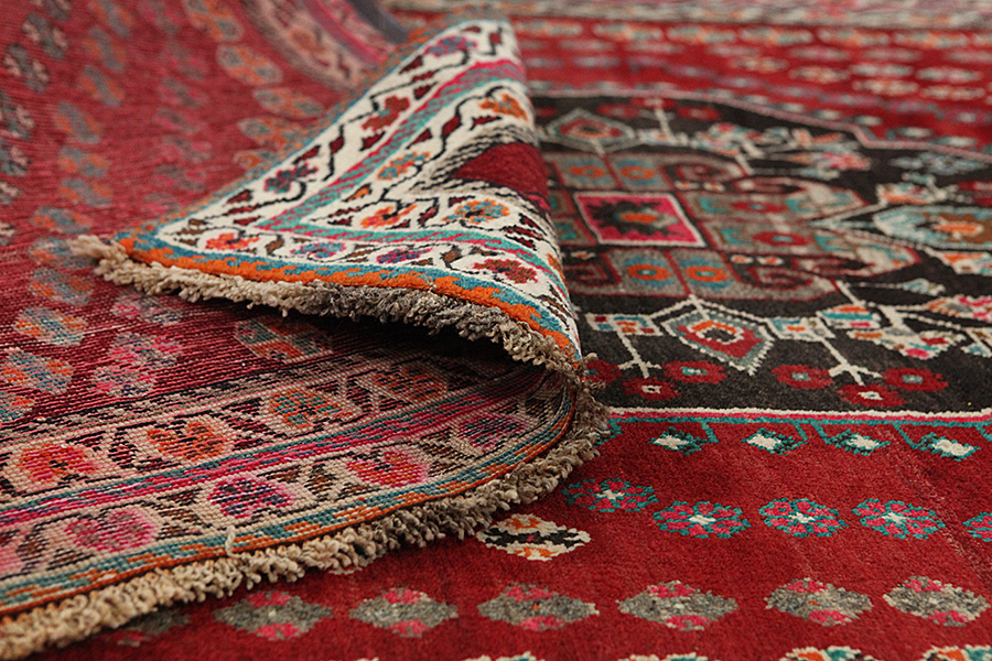 Qashqai Carpets : Qashqai carpets are woven by nomads who live in the mountainous areas of Southwest Persia, the provinces of Fars, Khuzestan, south of Isfahan and around the city Shiraz. Their carpets have a high knot density and a wide variety of designs, usually in deep red and blue colors. They weave carpets, Kilims and decorative textiles (ribbons, bags, etc.), which depict scenes from their lives with various representation of humans, animals, birds, trees and flowers. They also depict historical monuments, mostly from Persepolis.