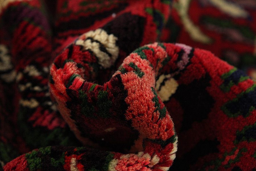 Abrash: Due to the different amount of grease in the wool and the added salt during the process of dyeing, the wool has got a varying colour absorbance. This is not very visible before weaving. During the weaving though, lines of the same colour are formed in the carpet. This is called Abrash (which in Farsi means little cloud) and it shows that the wool was not manufactured using chemical means and marks the naturalness and authenticity of the carpets. Examples