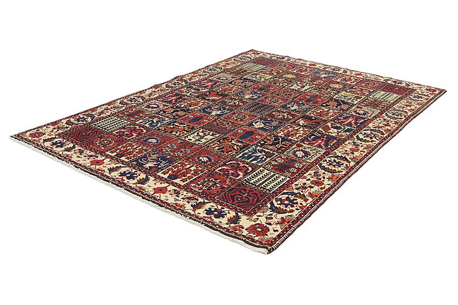 Bakhtiari Carpets : In the mountains Zagros, west of the city of Isfahan, around the town of Shahr-e-Kurd, live the nomads Bakhtiar. Their carpets are known for the design with various repeating squares in which flowers and animals are depicted. For this reason the design is called "garden"(Khesti). Their carpets are very durable with a dense weave and very good quality Persian wool coming from sheep grazing at a high altitude. The best Bakhtiar rugs and carpets with highest knot density are often called Bibibaff. Also in many designs we see influences from Isfahan carpets. (Boldaji - Feridan - Saman).