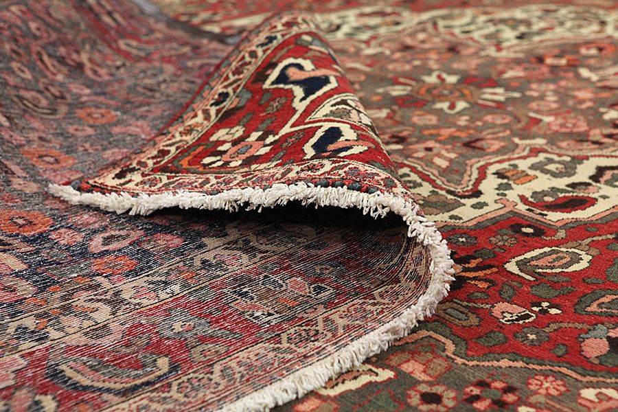Abrash: Due to the different amount of grease in the wool and the added salt during the process of dyeing, the wool has got a varying colour absorbance. This is not very visible before weaving. During the weaving though, lines of the same colour are formed in the carpet. This is called Abrash (which in Farsi means little cloud) and it shows that the wool was not manufactured using chemical means and marks the naturalness and authenticity of the carpets. Examples