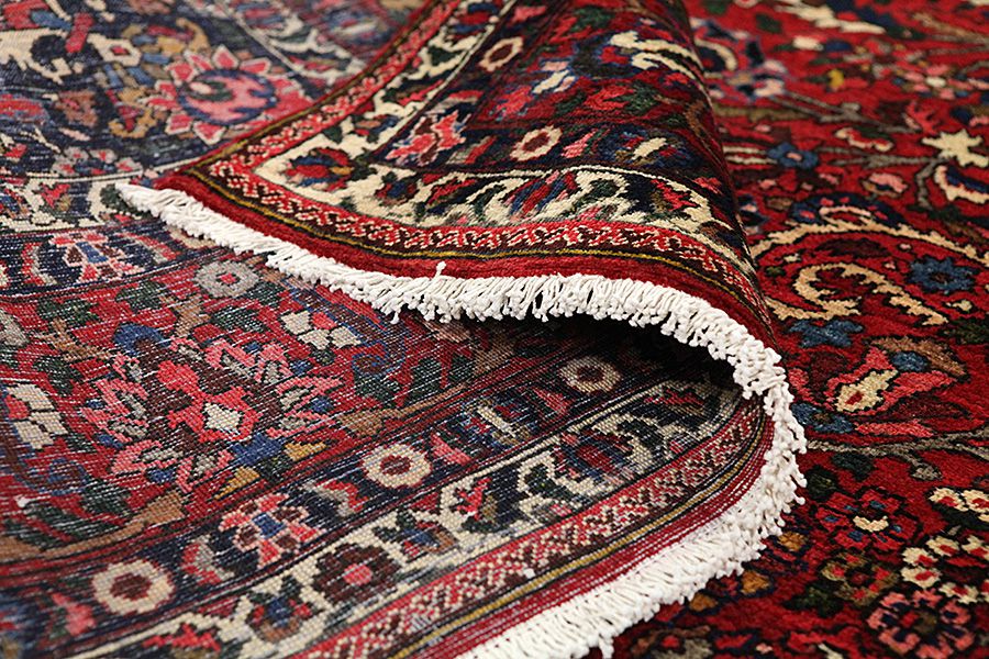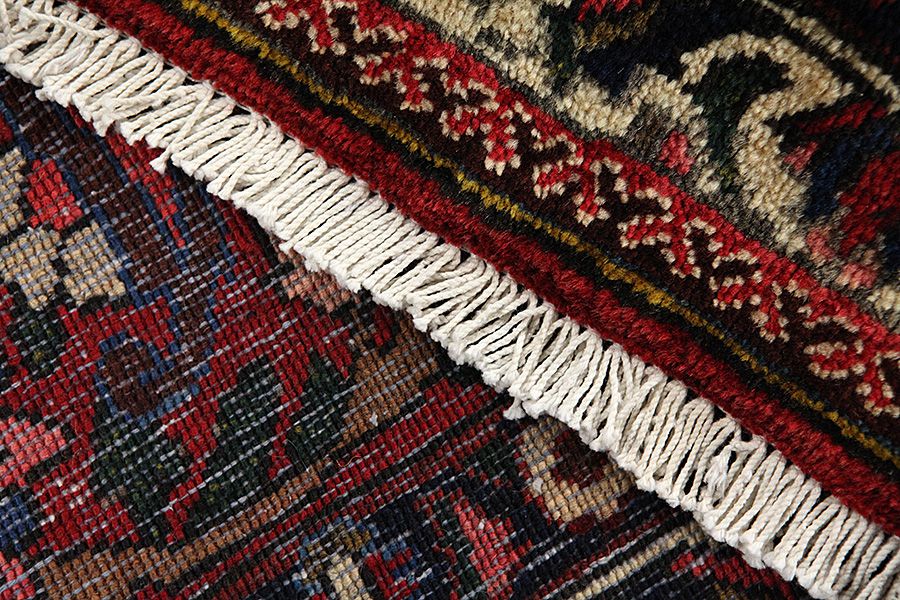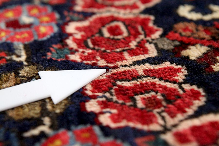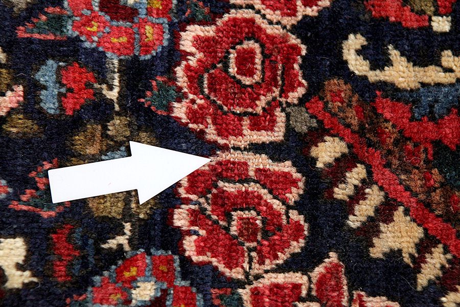 Abrash: Due to the different amount of grease in the wool and the added salt during the process of dyeing, the wool has got a varying colour absorbance. This is not very visible before weaving. During the weaving though, lines of the same colour are formed in the carpet. This is called Abrash (which in Farsi means little cloud) and it shows that the wool was not manufactured using chemical means and marks the naturalness and authenticity of the carpets. Examples
