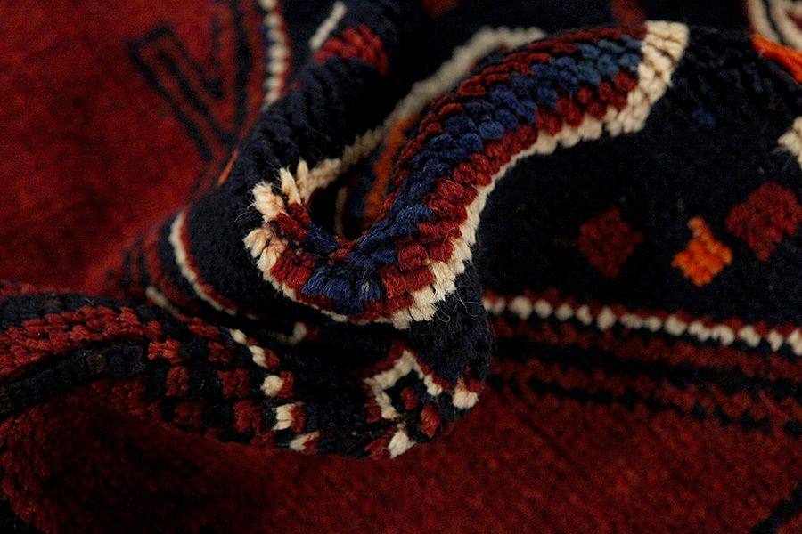 Qashqai Carpets : Qashqai carpets are woven by nomads who live in the mountainous areas of Southwest Persia, the provinces of Fars, Khuzestan, south of Isfahan and around the city Shiraz. Their carpets have a high knot density and a wide variety of designs, usually in deep red and blue colors. They weave carpets, Kilims and decorative textiles (ribbons, bags, etc.), which depict scenes from their lives with various representation of humans, animals, birds, trees and flowers. They also depict historical monuments, mostly from Persepolis.