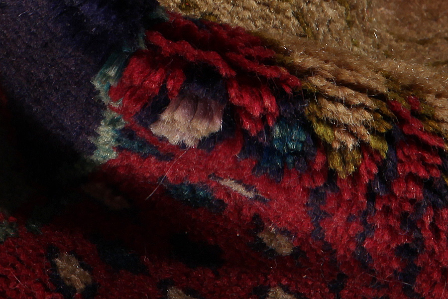 Abrash: Due to the different amount of grease in the wool and the added salt during the process of dyeing, the wool has got a varying colour absorbance. This is not very visible before weaving. During the weaving though, lines of the same colour are formed in the carpet. This is called Abrash (which in Farsi means little cloud) and it shows that the wool was not manufactured using chemical means and marks the naturalness and authenticity of the carpets. Examples