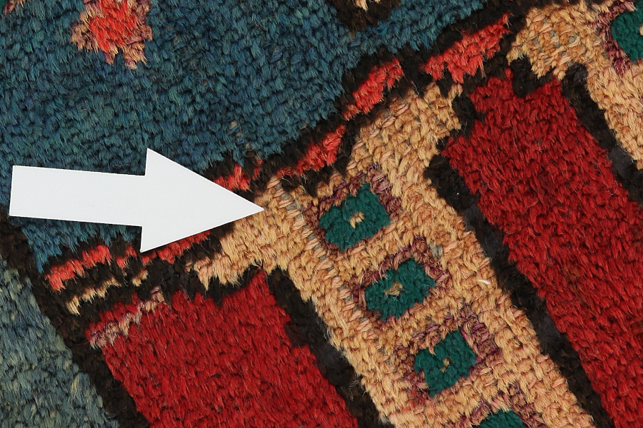 Abrash: Due to the different amount of grease in the wool and the added salt during the process of dyeing, the wool has got a varying colour absorbance. This is not very visible before weaving. During the weaving though, lines of the same colour are formed in the carpet. This is called Abrash (which in Farsi means little cloud) and it shows that the wool was not manufactured using chemical means and marks the naturalness and authenticity of the carpets. Examples