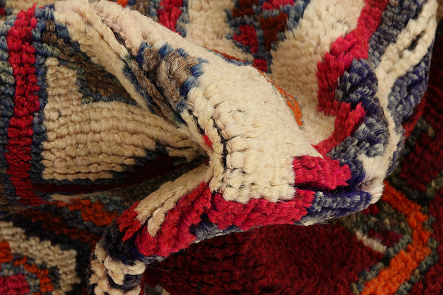 Abrash: Due to the different amount of grease in the wool and the added salt during the process of dyeing, the wool has got a varying colour absorbance. This is not very visible before weaving. During the weaving though, lines of the same colour are formed in the carpet. This is called Abrash (which in Farsi means little cloud) and it shows that the wool was not manufactured using chemical means and marks the naturalness and authenticity of the carpets. Examples
