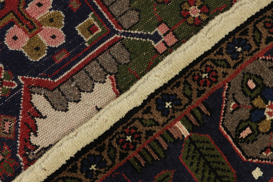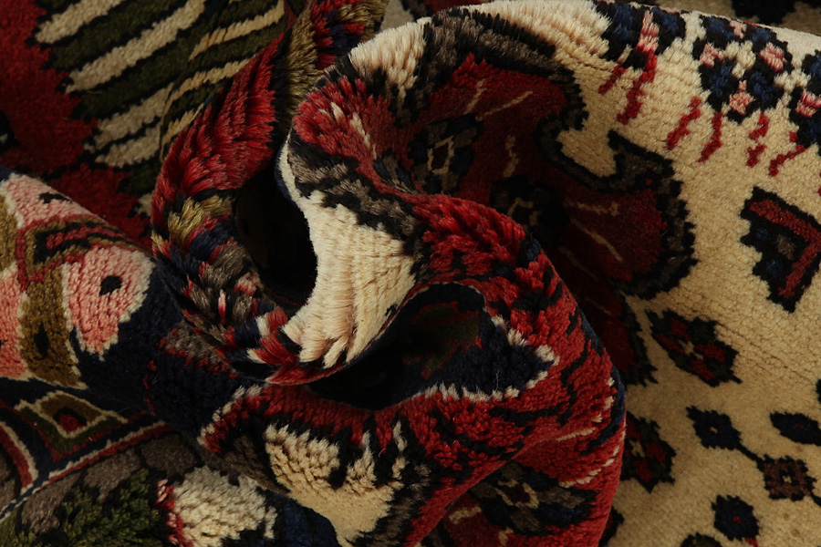 Abrash: Due to the different amount of grease in the wool and the added salt during the process of dyeing, the wool has got a varying colour absorbance. This is not very visible before weaving. During the weaving though, lines of the same colour are formed in the carpet. This is called Abrash (which in Farsi means little cloud) and it shows that the wool was not manufactured using chemical means and marks the naturalness and authenticity of the carpets. Examples