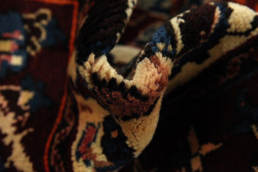 Abrash: Due to the different amount of grease in the wool and the added salt during the process of dyeing, the wool has got a varying colour absorbance. This is not very visible before weaving. During the weaving though, lines of the same colour are formed in the carpet. This is called Abrash (which in Farsi means little cloud) and it shows that the wool was not manufactured using chemical means and marks the naturalness and authenticity of the carpets. Examples